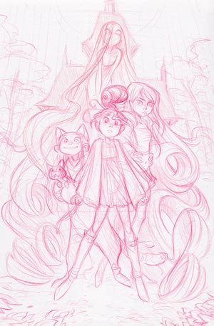 Il y avait déjà des visuels dans mon pitch initial, des personnages qui étaient déjà quasiment là comme la petite Lucille et sa soeur Cassiopée. J’avais plus de mal à trouver Sarah que j’avais d’abord envisager plus dans la fin de l’adolescence, vers les 18 ans, mais ça ne collait pas avec les autres. Au début, je voulais vraiment m’éloigner du style de W.I.T.C.H., j’ai fait des tas d’essais et de recherches, et je suis retourné de moi-même à ce premier style. Au final je me suis dit qu’il faut être sincère, qu’il faut dessiner comme on le sent. L’histoire qui était au départ légère a pris finalement de l’épaisseur et m’a fait retravailler les expressions des yeux, des gestes, comme j’avais pu déjà l’expérimenter sur W.I.T.C.H. mais avec un côté artistique un peu plus poussé avec l’aquarelle.