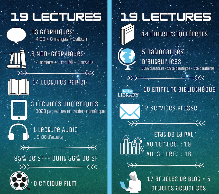 J'ai terminé l'année avec un bilan riche de lectures puisque j'ai lu 19 titres dont une majorité de lectures graphiques pour me dorloter durant les fêtes et rattraper mon retard dans les mangas en cours. Un mois avec de belles découvertes et de l'évasion.