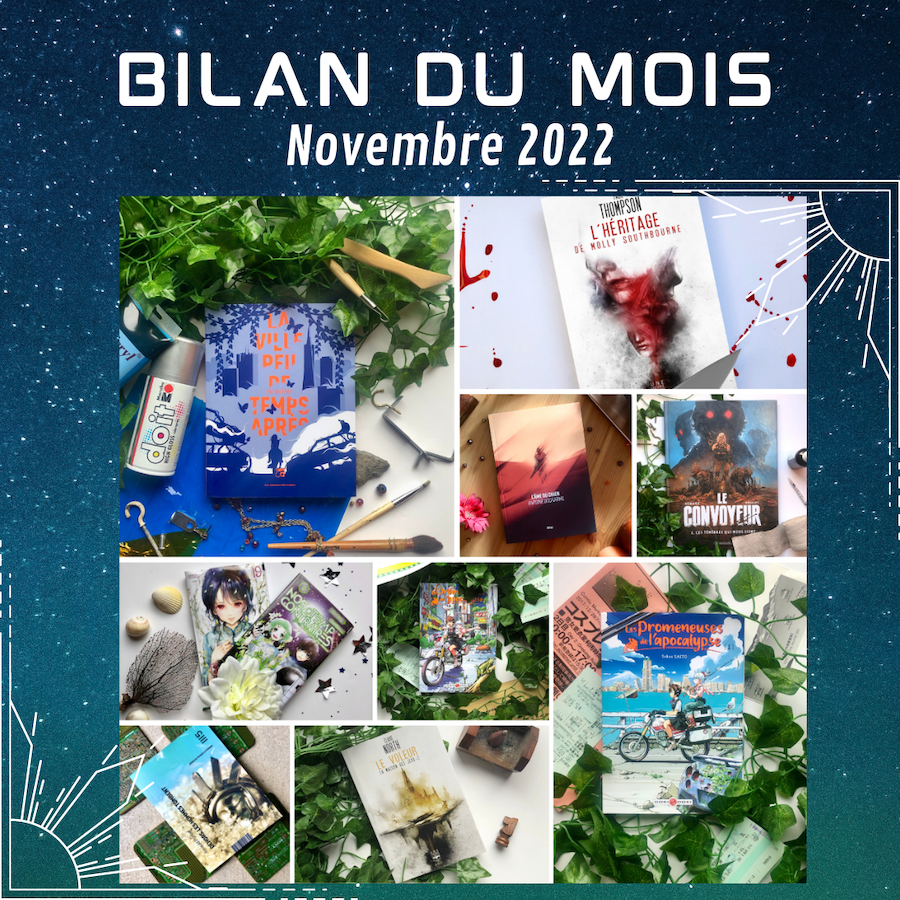 J'ai repris doucement goût à la lecture en novembre et j'ai décidé de me tourner vers des valeurs sûres et des livres de ma PAL pour passer de bons moments (et c'est réussi!). En novembre je me suis également beaucoup investi dans Mastodon, réseau où j'apprécie la bienveillance et la discussion. N'hésitez à m'y retrouver. J'ai également rédigé mon article sur les livres à glisser sous le sapin. Retrouvez-y des idées de cadeaux à (vous) faire parmi mes lectures de l'année. Vous pourrez aussi piocher des idées dans mes 20 meilleures lectures de l'année (BD et romans) que je vais poster à raison d'une par jour à partir du samedi 3 décembre sur les réseaux sociaux.
